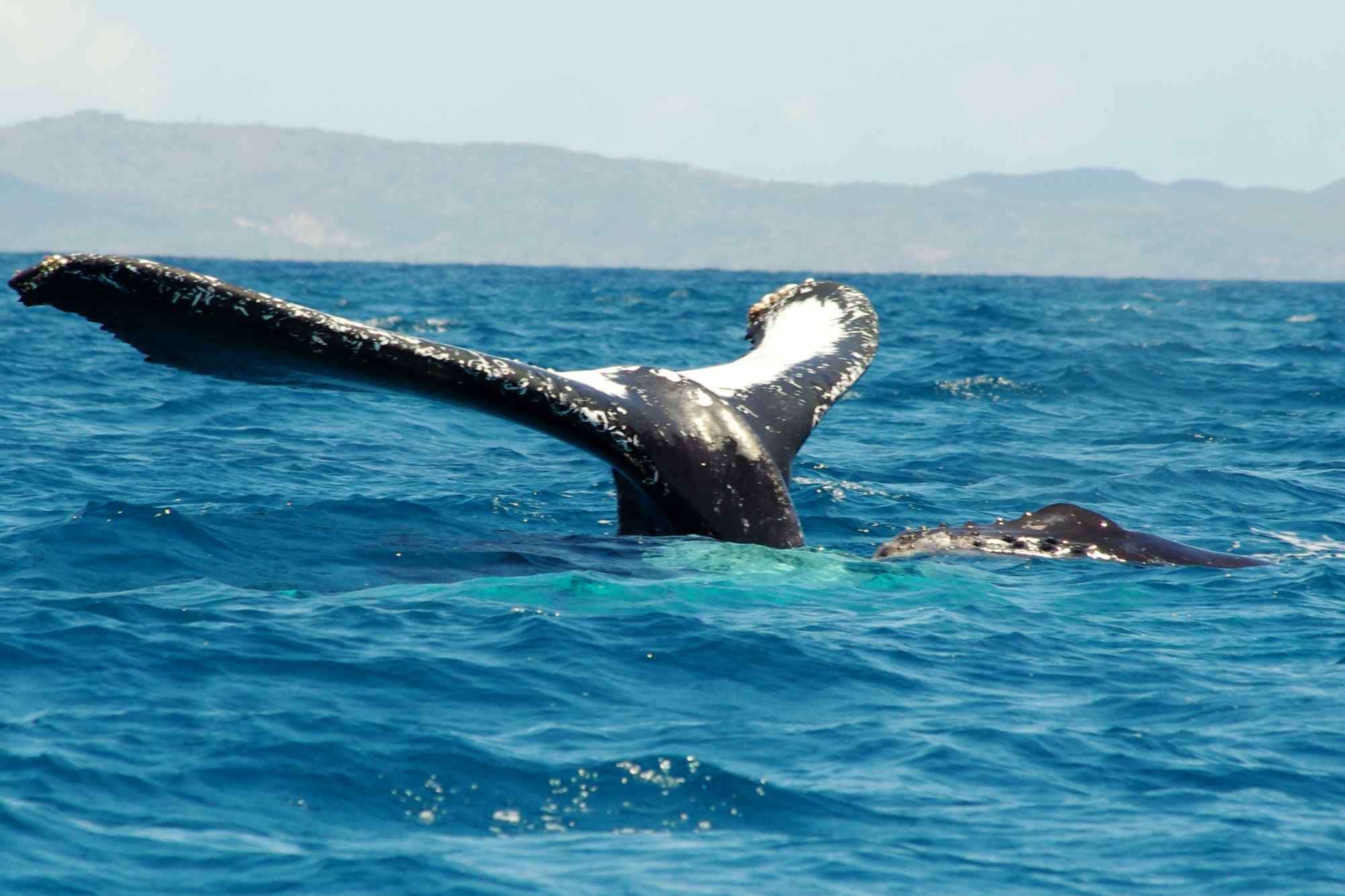 A 8h30: Briefing et départ pour l’observation des Baleines à Bosse. Cependant, la matinée est consacrée à la recherche et à l’observation des baleines à bosse et des dauphins. Pourtant c’est l’occasion d’assister à un spectacle extraordinaire : Couple mère/baleineau se reposant en surface, frappes de caudale et pectorales et souvent des sauts spectaculaires !